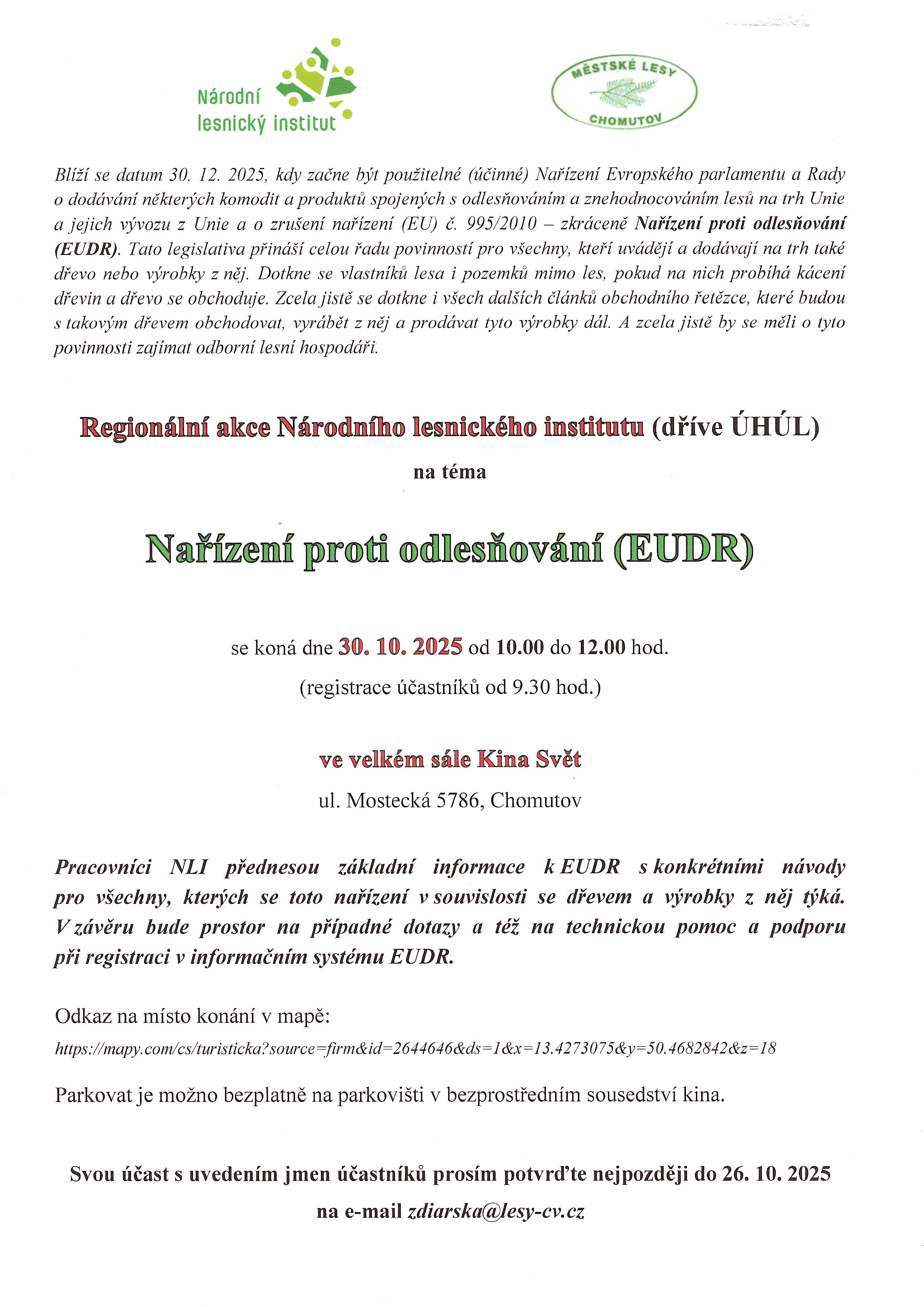 30. 10. 2025 se koná ve velkém sále Kina Svět Chomutov seminář pořádaný Národním lesnickým institutem (NIL) ve spolupráci s Městskými lesy Chomutov na téma Nařízení proti odlesňování.
